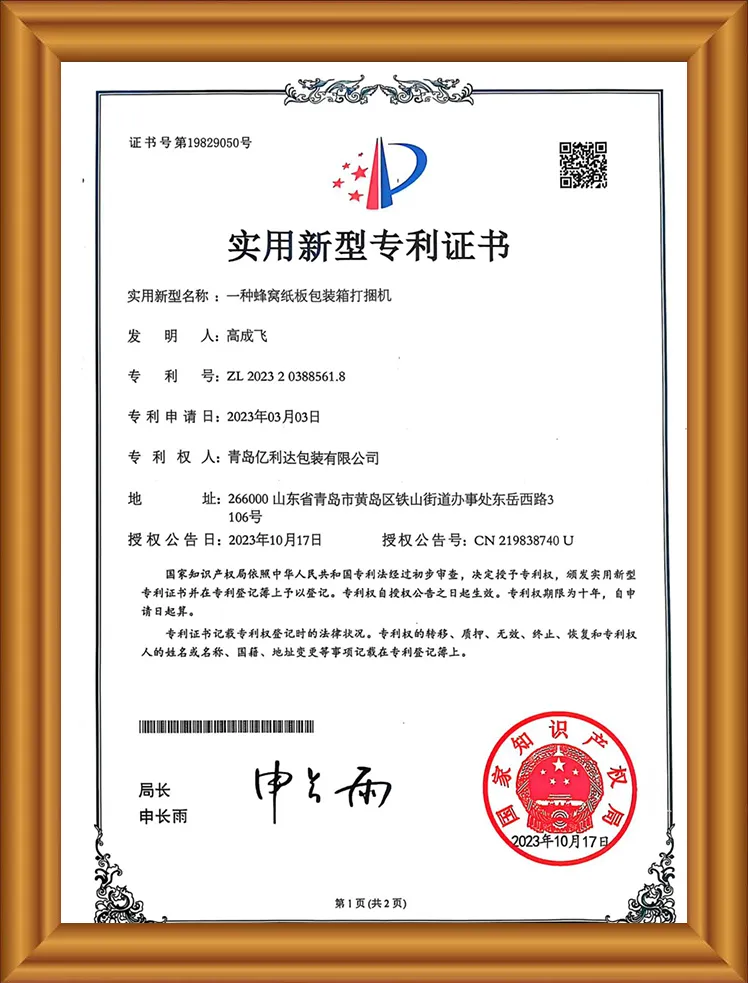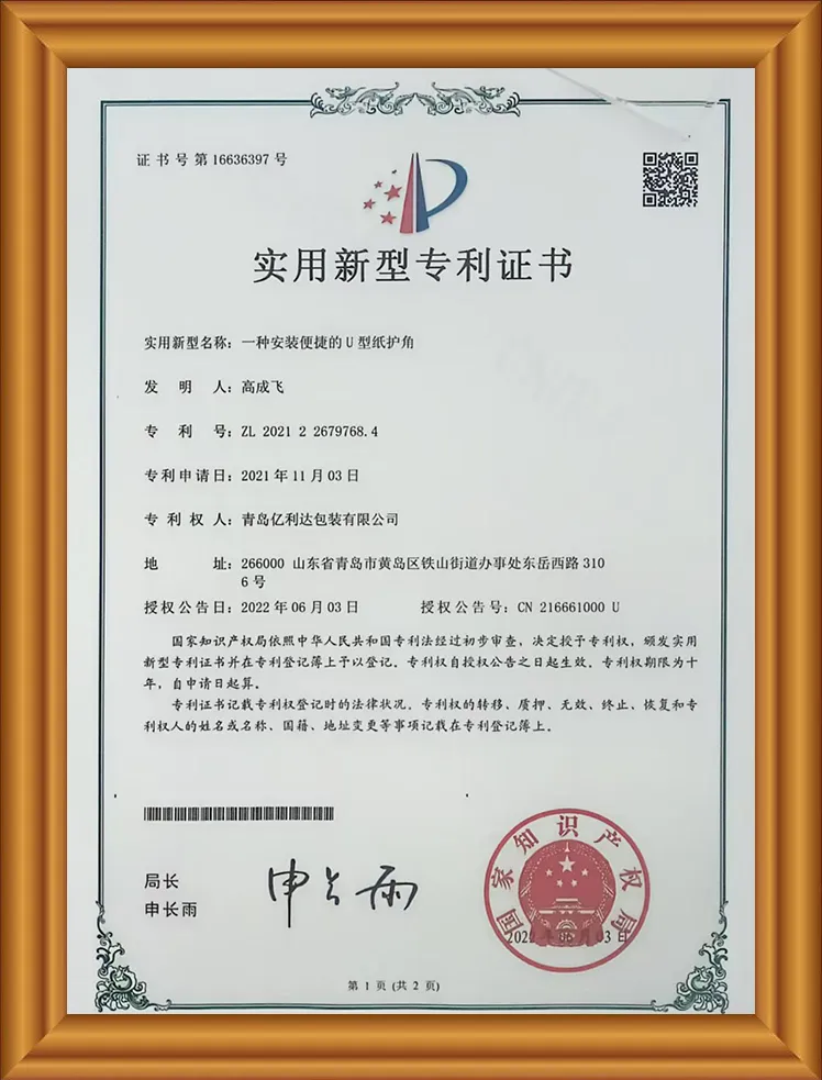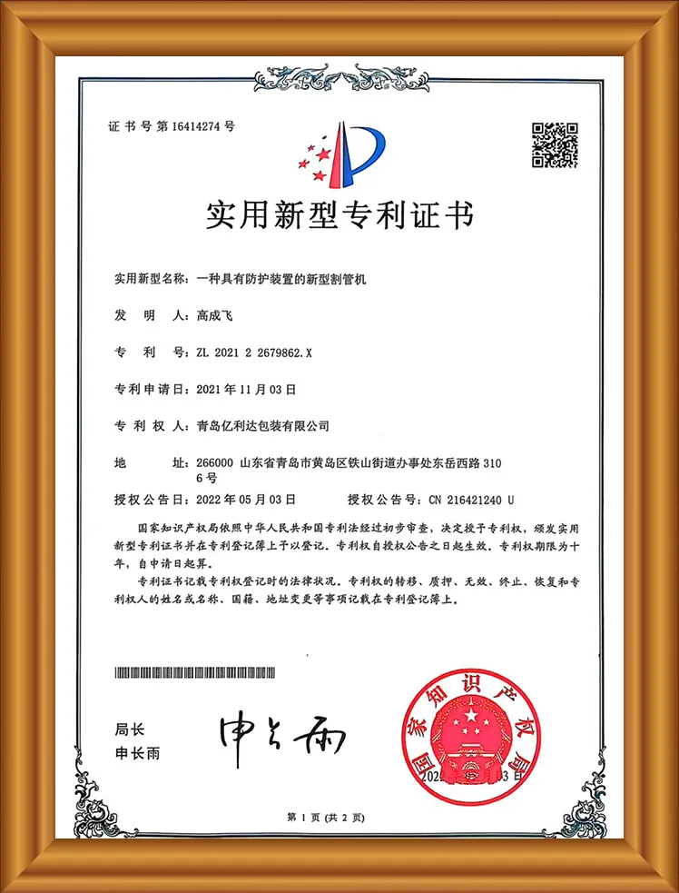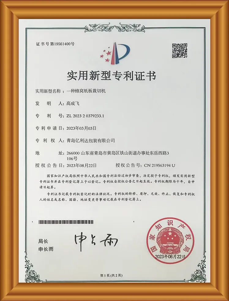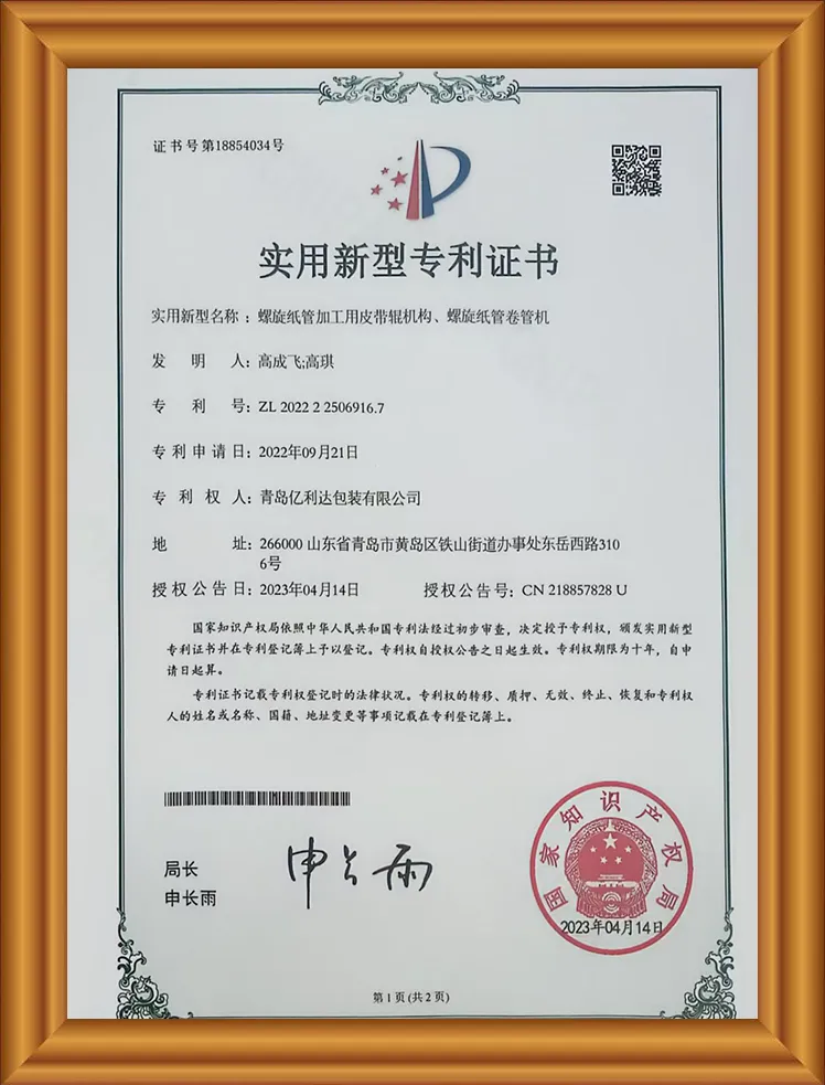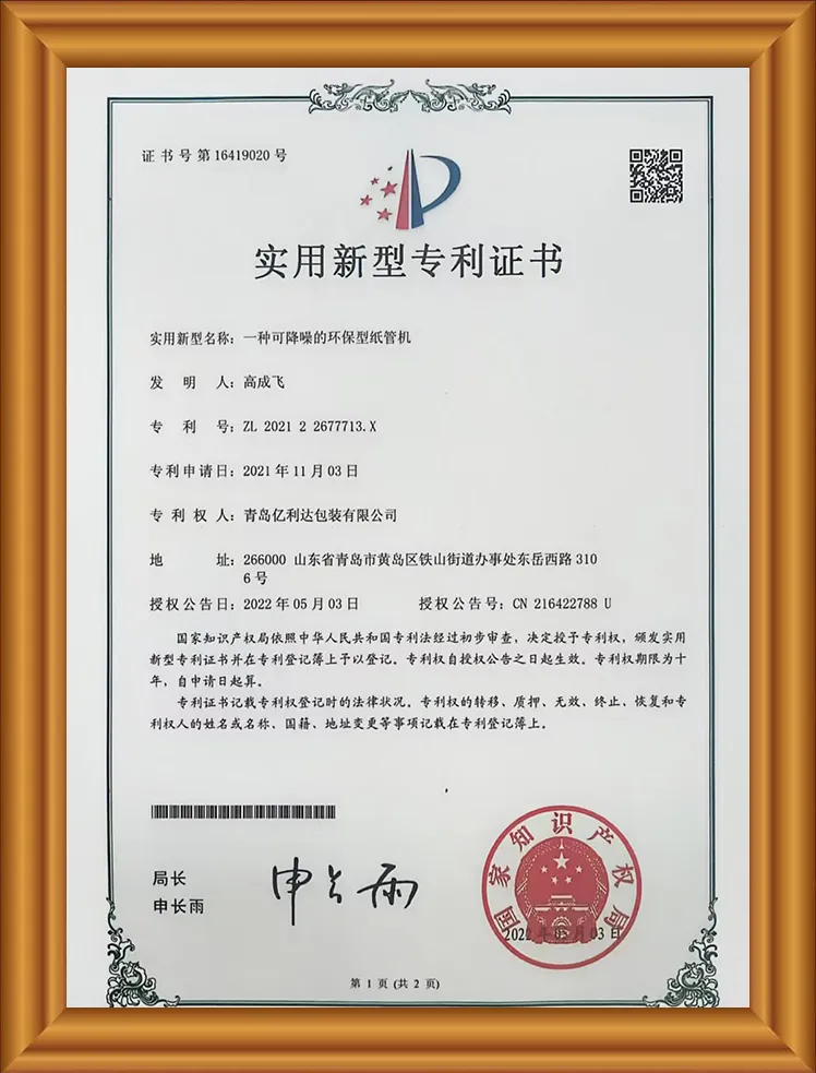 Termékeink FSC tanúsítvánnyal rendelkeznek, ISO9001 tanúsítvánnyal rendelkeznek, hét szabadalommal rendelkeznek, köztük egy kényelmes U-alakú papírcső gép, egy speciális és innovatív kis- és középvállalkozási tanúsítvány, Puni tesztelés és minőségi beszállítói tanúsítvány.